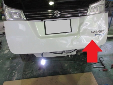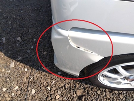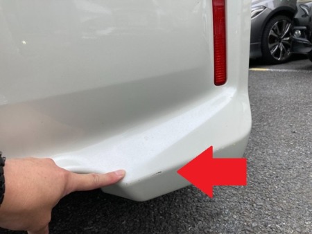 ▼ バンパーもずれてしまっていますが指で示している個所に傷がありました。