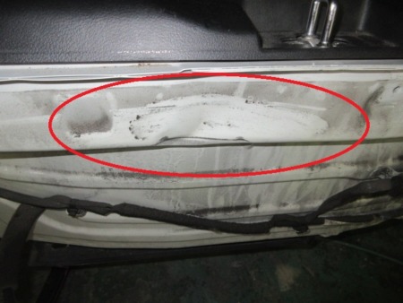 ▼ 予想していた通り、衝突の強い衝撃により内部骨格のバックパネルに数か所で凹み傷が確認できました。そこは板金で対応したいと思います。