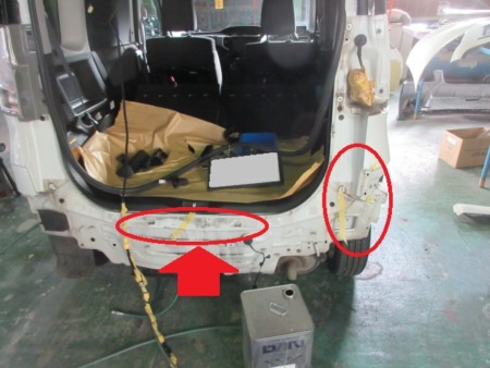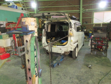 ▼ バックパネルの凹みの修正は、車をジャッキで固定し、本体に引っ張り用治具を取りつけチェーンブロックと強力なパワーの油圧装置を使いダメージを受けた数か所について引っ張りながら修正します。