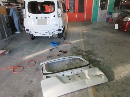 ▼ 破損したドアを取り外し新品のバックドアを建付けを確認して取り付けました。