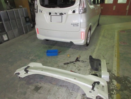 ▼ 新品のリアバンパーと塗装が完了したクオーターパネルも取りつけます。