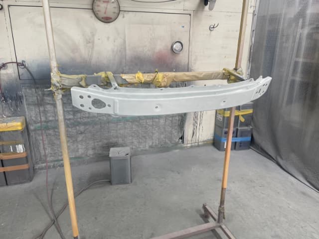 ▼ 新品のバンパーリインフォースメントも現車の色に合わせて塗装をします。