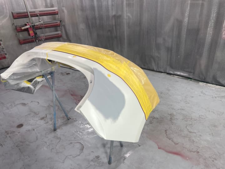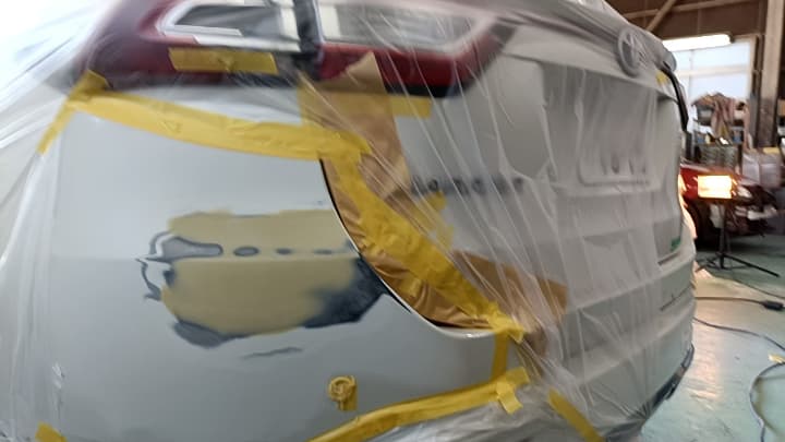 サフェーサ塗布する際にはサフェーサが周囲にかからないように専用のシートで養生をしてからサフェーサを吹き付けます。