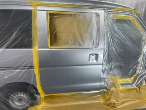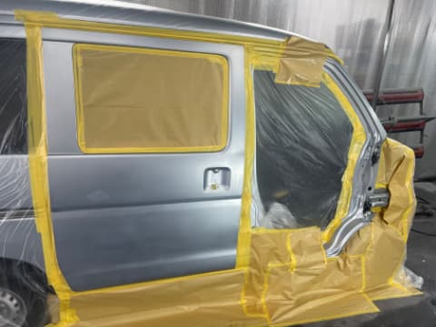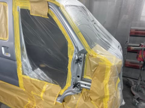 ▼ フロントドアはリサイクル部品での対応となり現車の色に合わせて塗装をします。