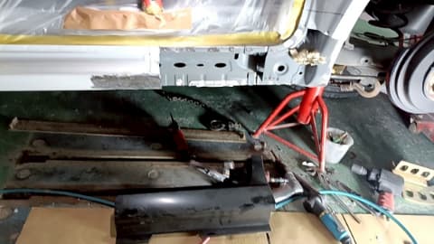 ▼ 鉄板をサイドシルの形状に合わせて加工して溶接で取り付けます。その後にサフェーサを塗布します。