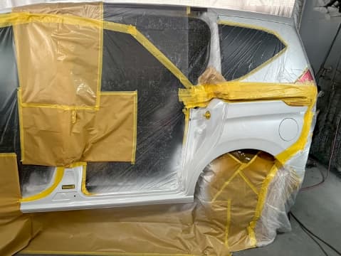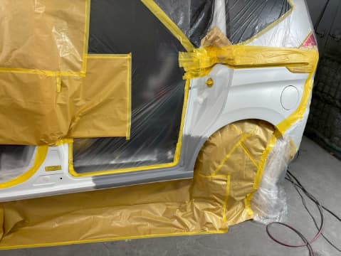▼ 当社のベテランの塗装職人により塗料の調合を行いベースカラーを調色して、サイドシルとクオーターパネルの塗装をします。サフェーサが完全に隠蔽されていることを確認しながら塗装をします。